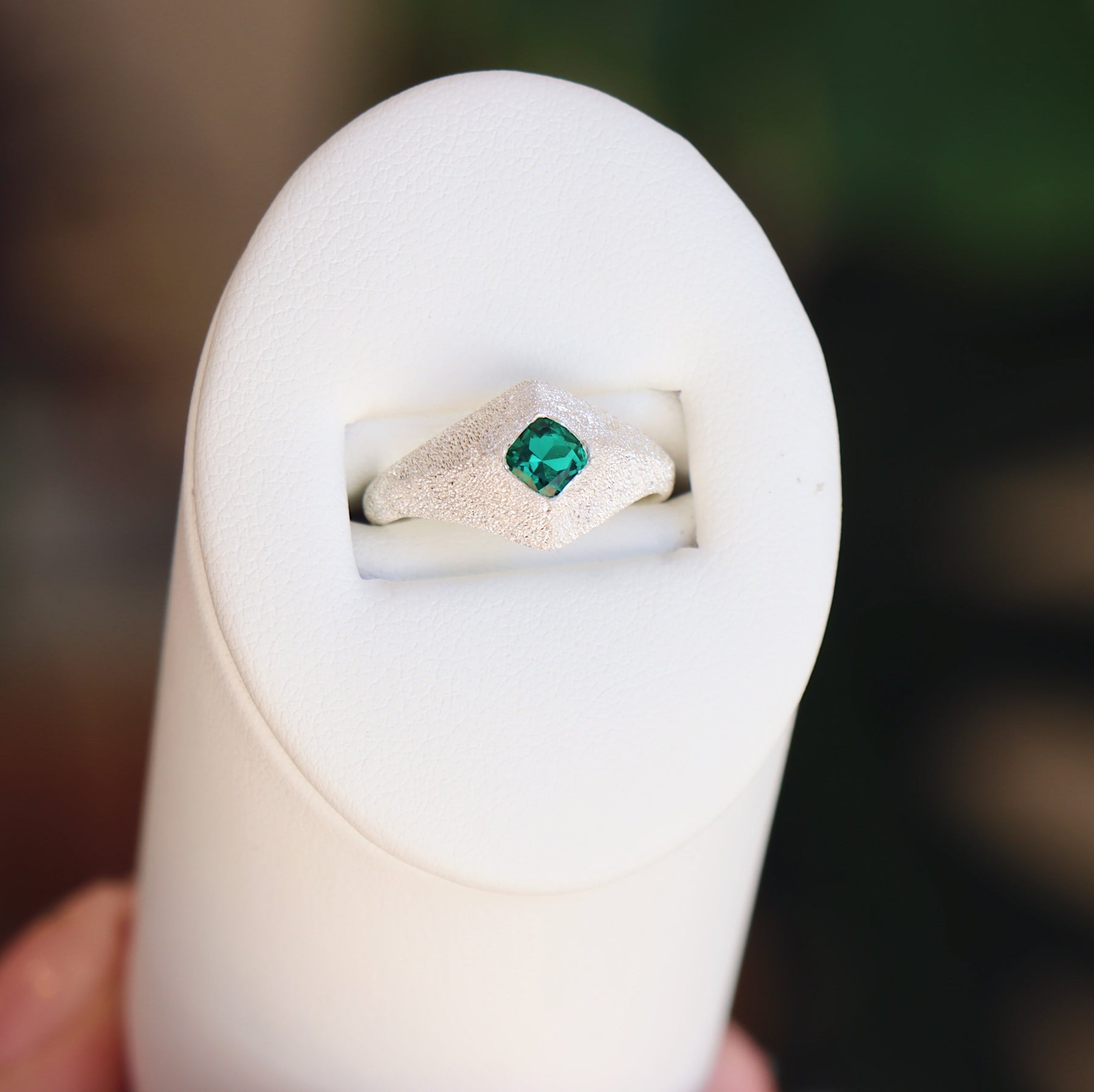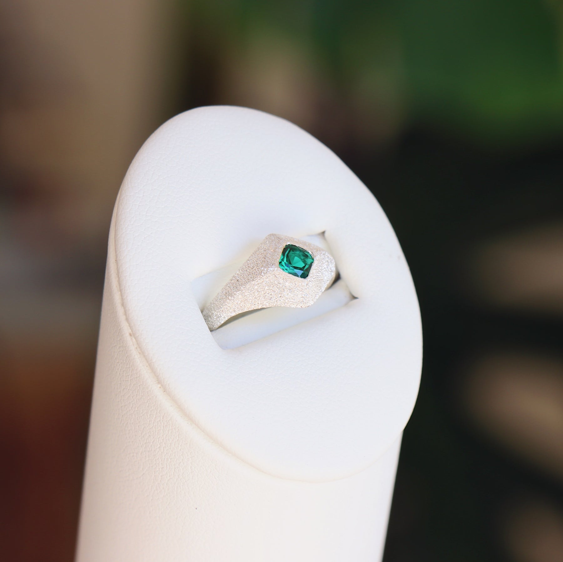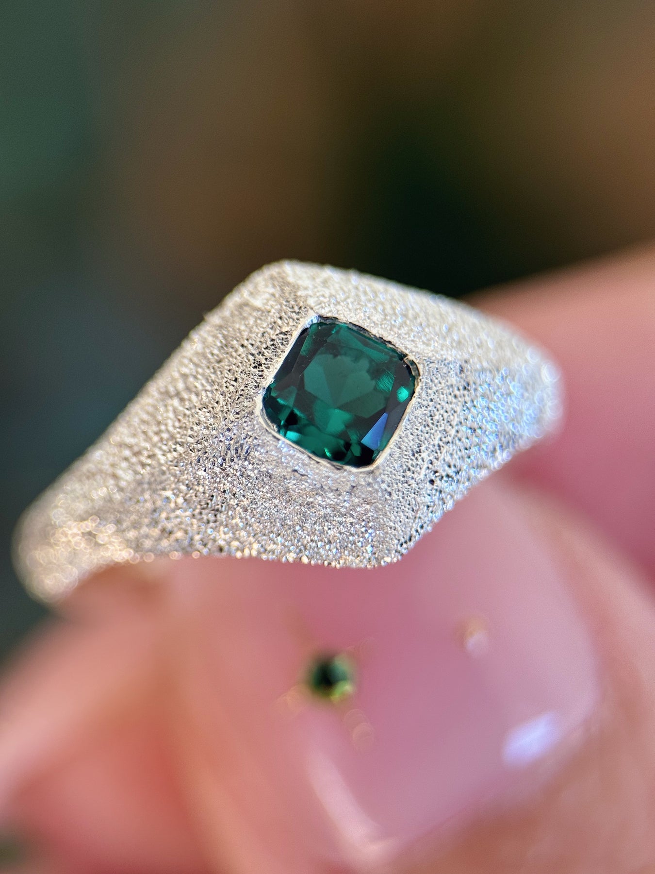 The Freya is a gorgeous glittering signet style ring. The flashy texture compliments your gemstone choice in such a unique way! The Aquamarine and the Garnet are the only two gemstones with checkerboard faceted face, all other gems have a traditional flat face.
