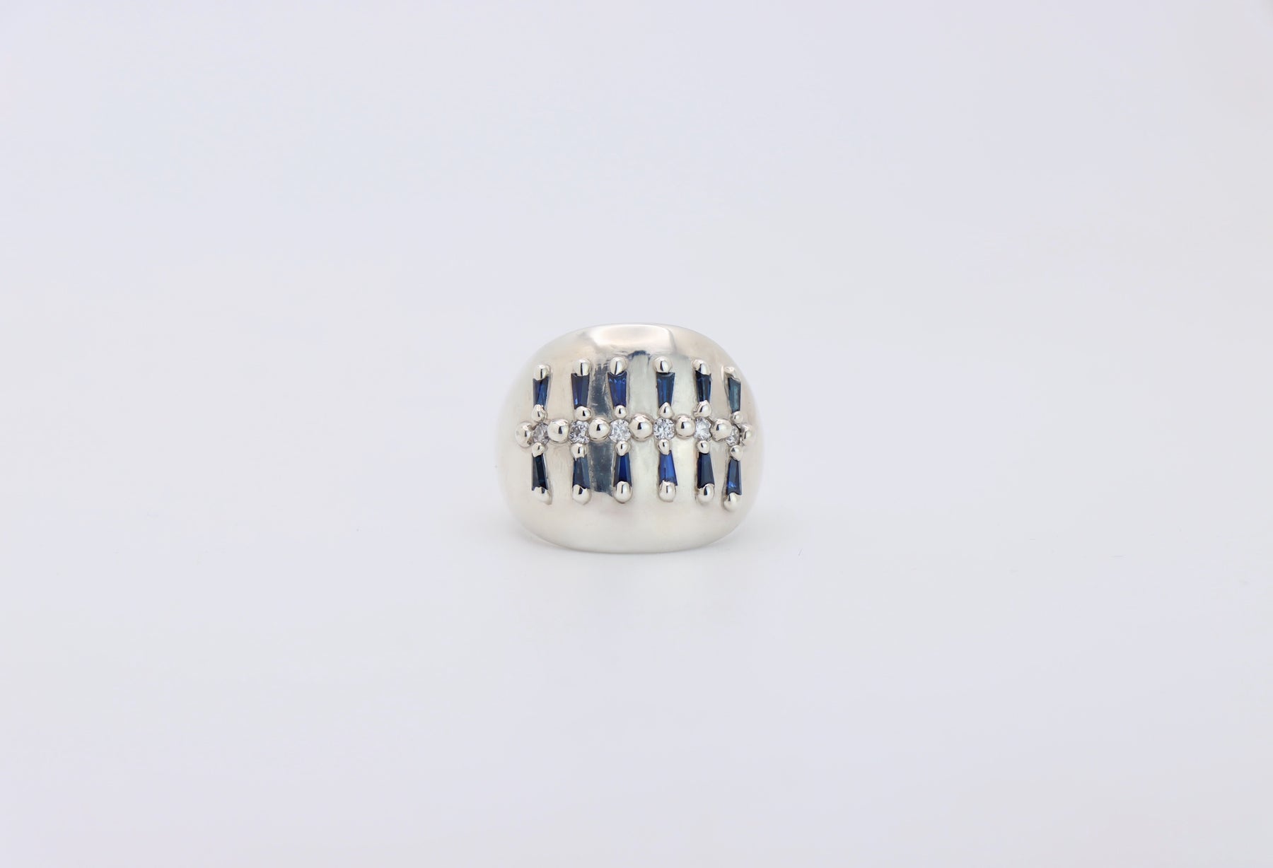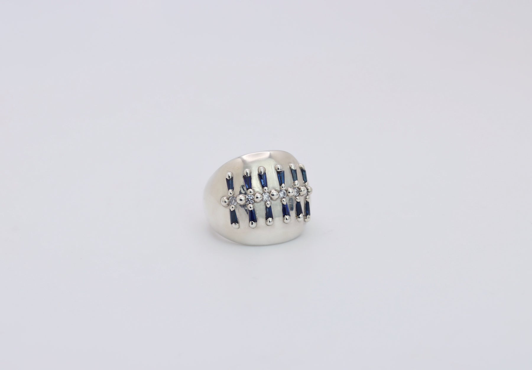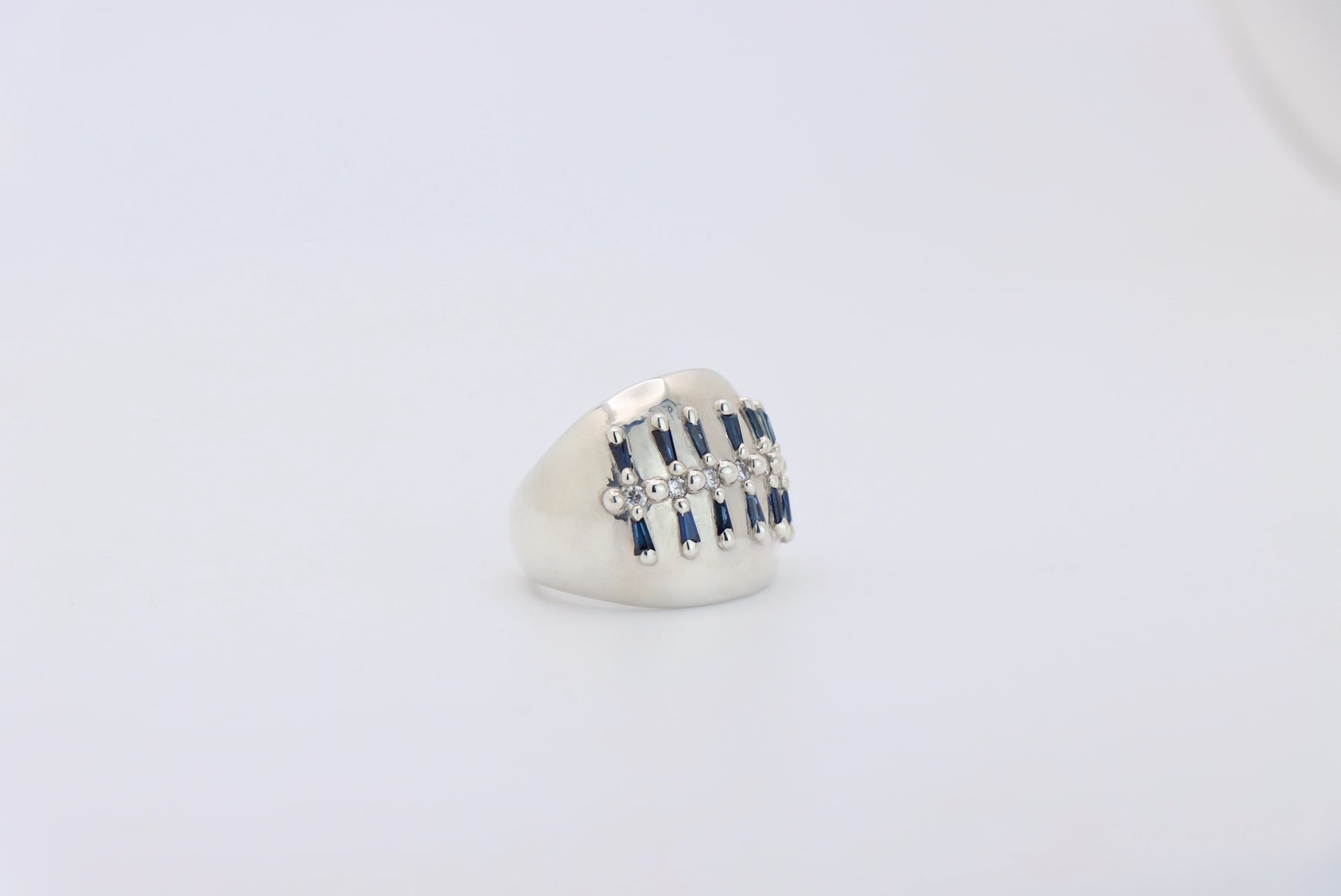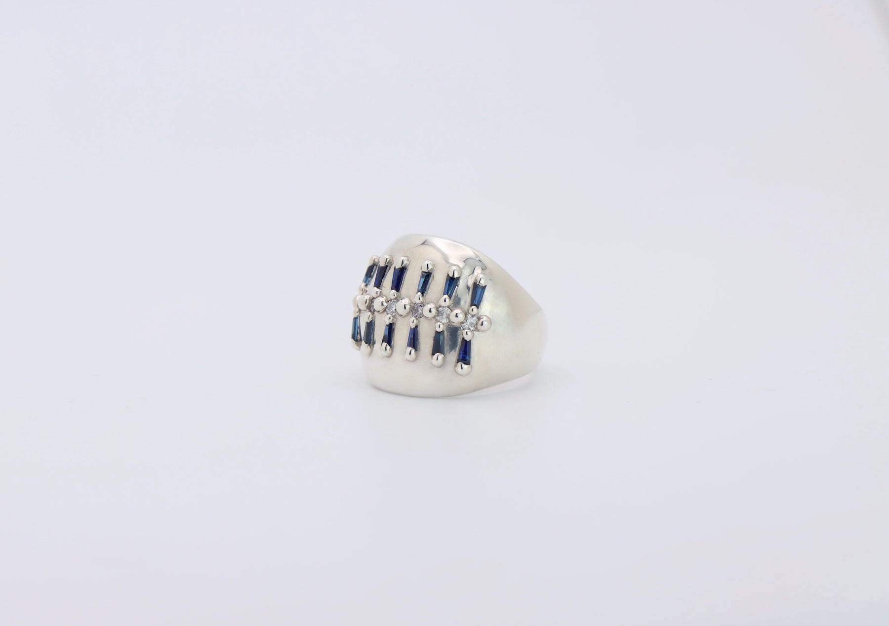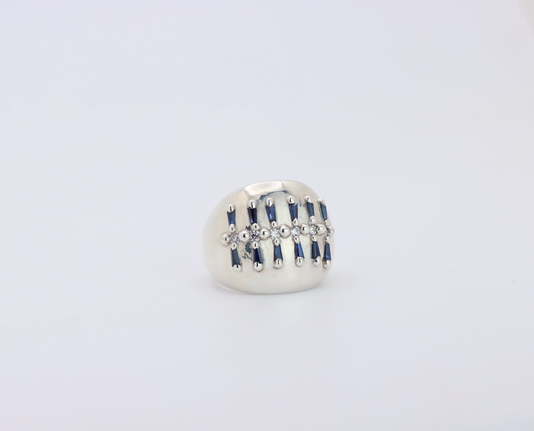 The Andromeda ring is such a stand out design. This is a solid ring that is not hollowed out and is adorned with blue tapered baguette Australian sapphires and moissanite. The Andromeda ring can be made in silver, 10k, 14k or 18k gold. This ring is comfortable enough to wear it every day and is luxuriously weighted.