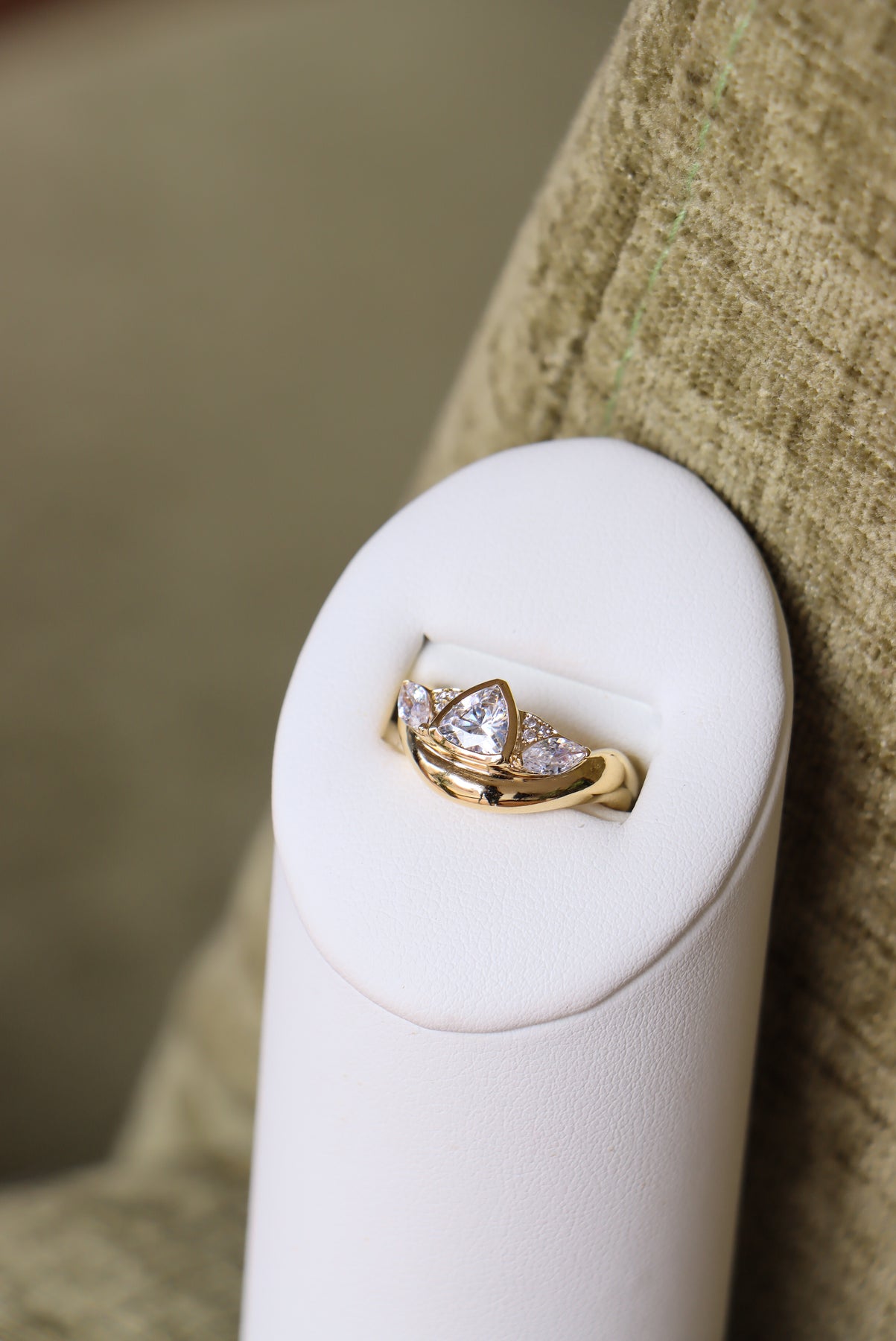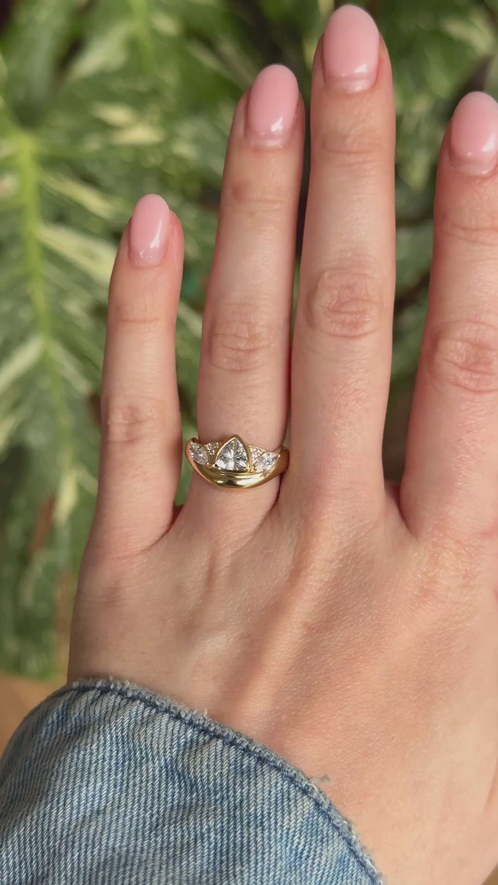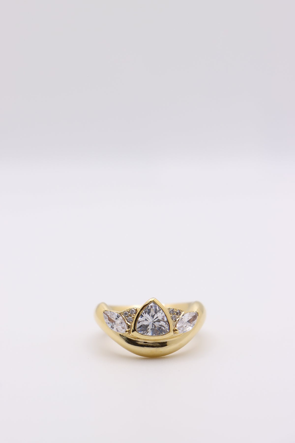 The Trinity Arc Ring is made to feel elegant but strong. The sweeping curves almost remind me of angel wings, gently wrapping around the center stone. This ring has an luxurious weighted feel to it and will surely last through generations to come.